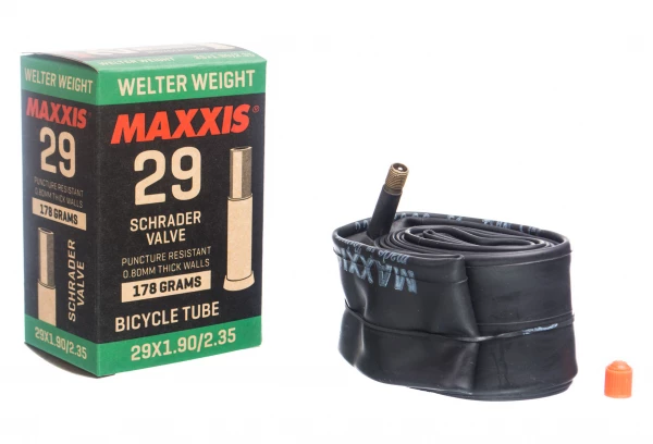 Chambre à air Maxxis Welter Weight avec valve Schrader. Bon compromis entre légèreté et durabilité.