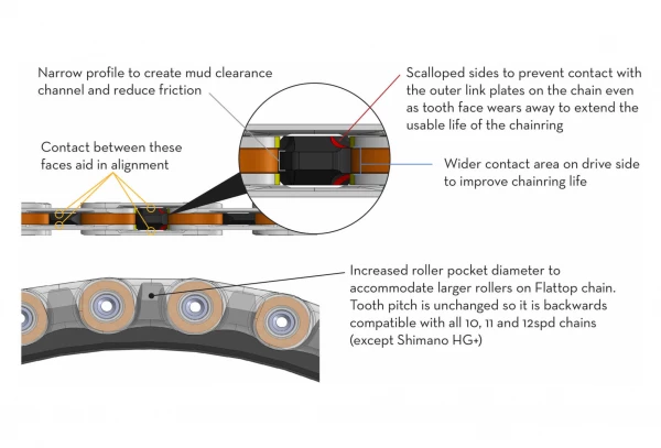 - Le profil de dent Drop-Stop B est compatible avec la chaîne Sram Flattop.